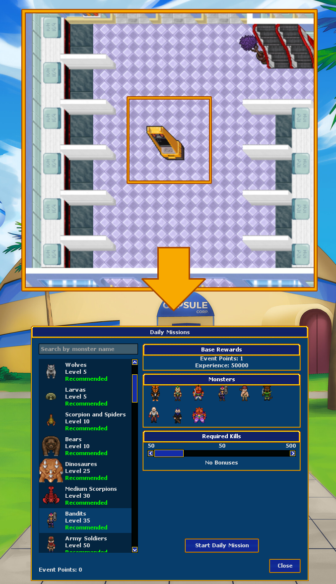 You are able to take a quest from a special column and select a certain type of monsters to complete the daily quest.You will also be able to manipulate the amount of monsters to increase the amount of exp and event points.